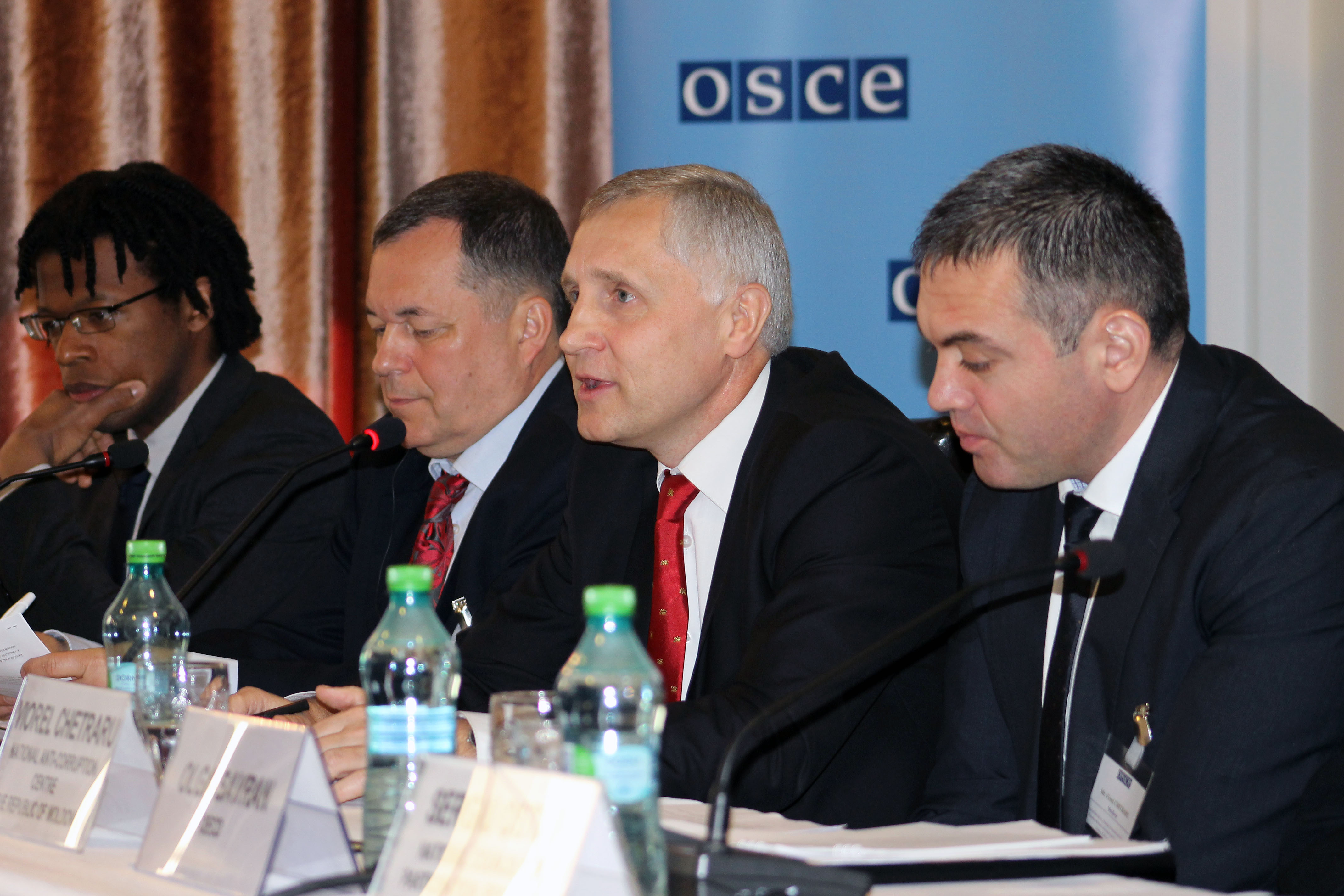(L-r) William Nero, Programme Officer at the Basel Institute on Governance in Switzerland; Alexey Stukalo, Deputy Co-ordinator/Head of Economic Activities at the Office of the Co-ordinator of OSCE Economic and Environmental Activities; Moldova's Deputy Minister of Justice Nicolae Esanu; and Viorel Chetraru, Director of Moldova's National Anti-corruption Centre, Chisinau, 28 April 2015.