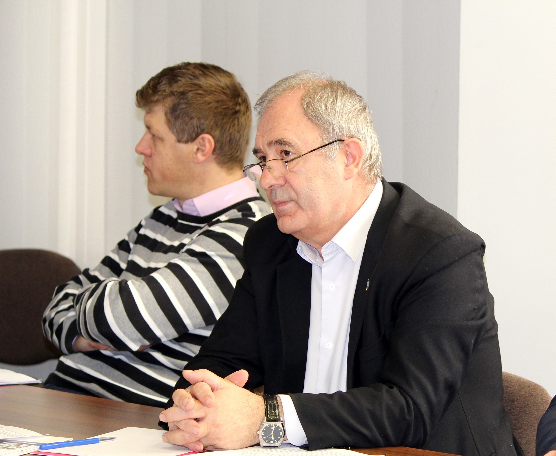 Valeriu Ianioglo, Director of the Agency of Regional Development of the Autonomous Territorial Unit of Gagauzia (r), participates at a roundtable meeting, Chisinau, 6 December 2016.