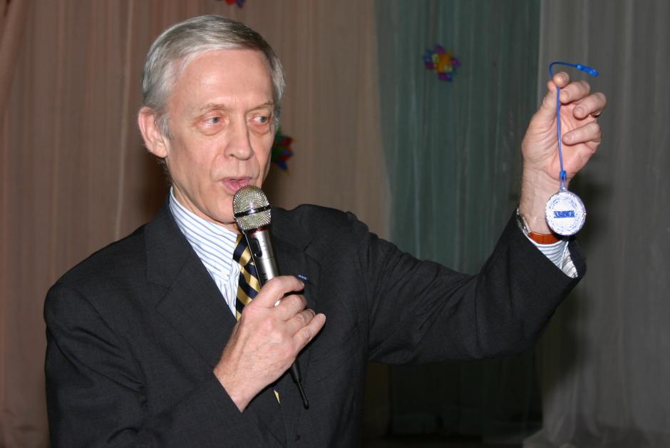 Amb. William Hill holds a reflector donated by the OSCE Mission to Moldova to pupils of the Sibirski Lyceum in Chisinau, 18 Nov 2004. The Mission will distribute over 15,000 reflectors throughout the country to make kids safer on the way to school.