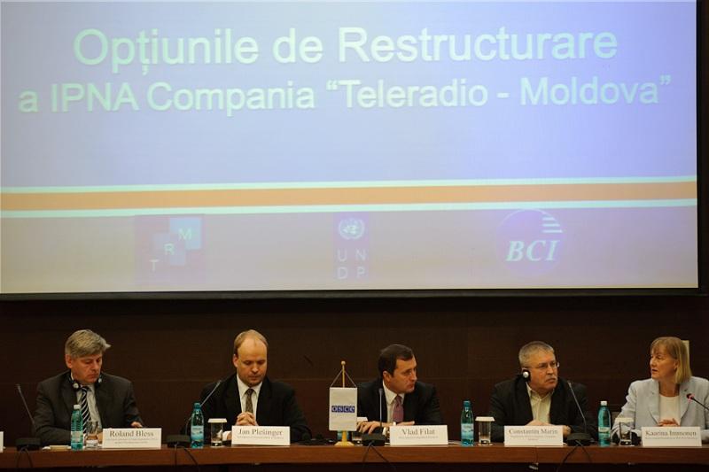 L-r: Principal Adviser to the OSCE Representative for Freedom of the Media Roland Bless, Deputy Head of the OSCE Mission to Moldova Jan Plešinger, Moldovan Prime Minister Vlad Filat, President of Teleradio-Moldova Constantin Marin and UNDP Moldova Resident Representative Kaarina Immonen welcome participants to the high-level conference "Rethink Teleradio-Moldova" on the reform of the public broadcaster, Chişinău, 23 September 2011.