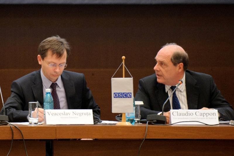 Vice-President of the European Broadcasting Union Claudio Cappon addresses Moldovan Finance Minister Veaceslav Negruţa during his keynote speech on the need for a strong and sustainable public service broadcaster.