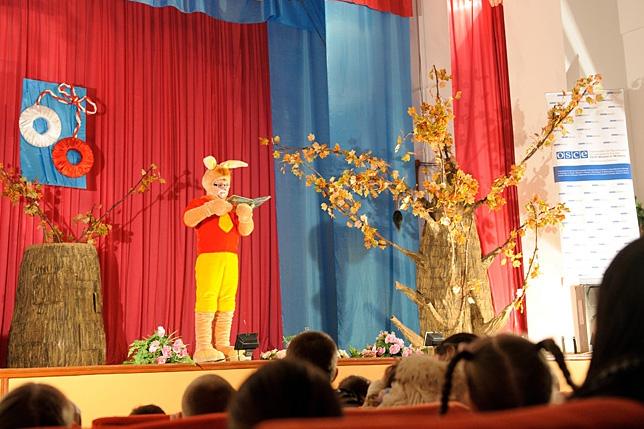 Children from Moldovan and Russian schools fill the village’s House of Culture to watch the theatre’s performance.