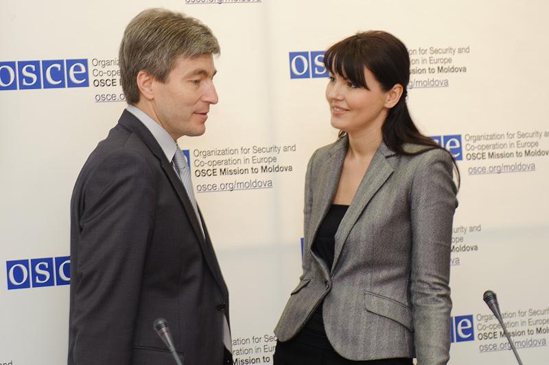 Moldovan and Transdniestrian chief negotiators Eugen Carpov and Nina Shtanski in discussion, Chisinau, 28 March 2012.