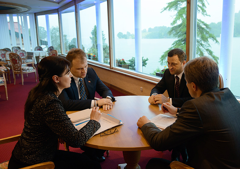 Moldovan and Transdniestrian leaders Vladimir Filat (center-right) and Yevgeny Shevchuk (center-left), alongside chief political negotiators, Eugen Carpov (right) and Nina Shtanski in a bilateral meeting on the margins of the OSCE conference on confidence-building measures. Rottach-Egern, Germany, 20 June 2012.