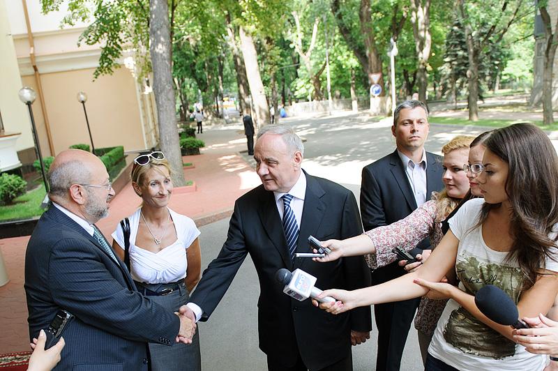 OSCE Secretary General Lamberto Zannier (l) shakes hands with Moldovan President Nicolae Timofti following their joint press briefing, 17 July 2012, Chisinau.