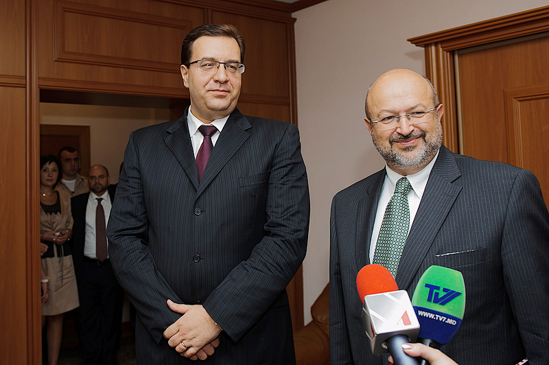 OSCE Secretary General Lamberto Zannier (r) and Moldovan Parliament Speaker Marian Lupu brief journalists following a meeting, Chisinau, 17 July 2012.