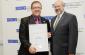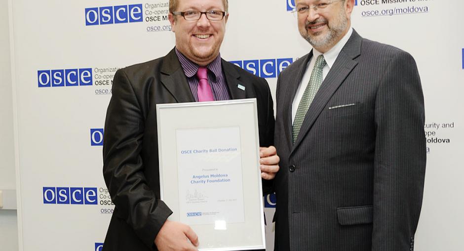 OSCE Secretary General Lamberto Zannier (r) hands over a 2012 OSCE Charity Ball donation certificate to John McKellar, Country Manager of the Angelus Moldova, a hospice for patients with cancer and other life-threatening illnesses, Chisinau, 17 July 2012. (OSCE/Igor Schimbător)