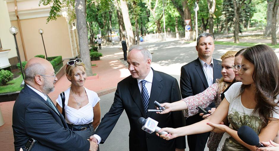 OSCE Secretary General Lamberto Zannier (r) and Moldovan Parliament Speaker Marian Lupu brief journalists following a meeting, Chisinau, 17 July 2012. (OSCE/Igor Schimbător)