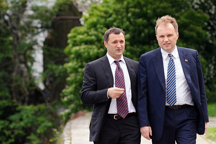 Moldovan Prime Minister Vladimir Filat (l) and Transdniestrian leader Yevgeny Shevchuk meeting on the margins of an OSCE conference in the German town of Rottach-Egern, 20 June 2012.