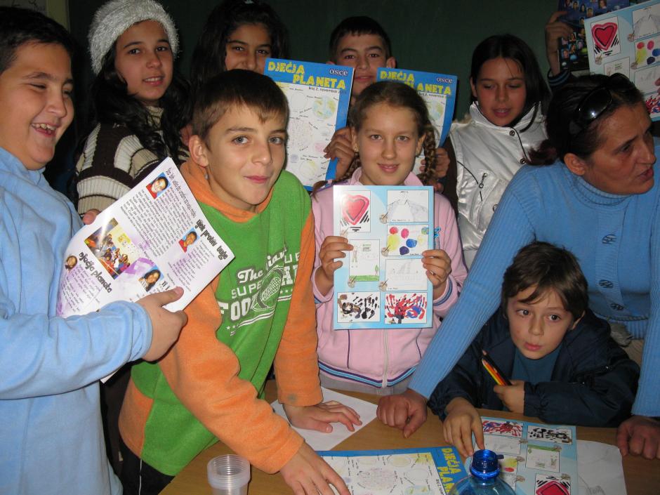 Children from the "Marshal Tito" elementary school in Ulcinj, Montenegro, holding the second issue of their magazine Djecja Planeta (Children's Planet), 22 December 2008.