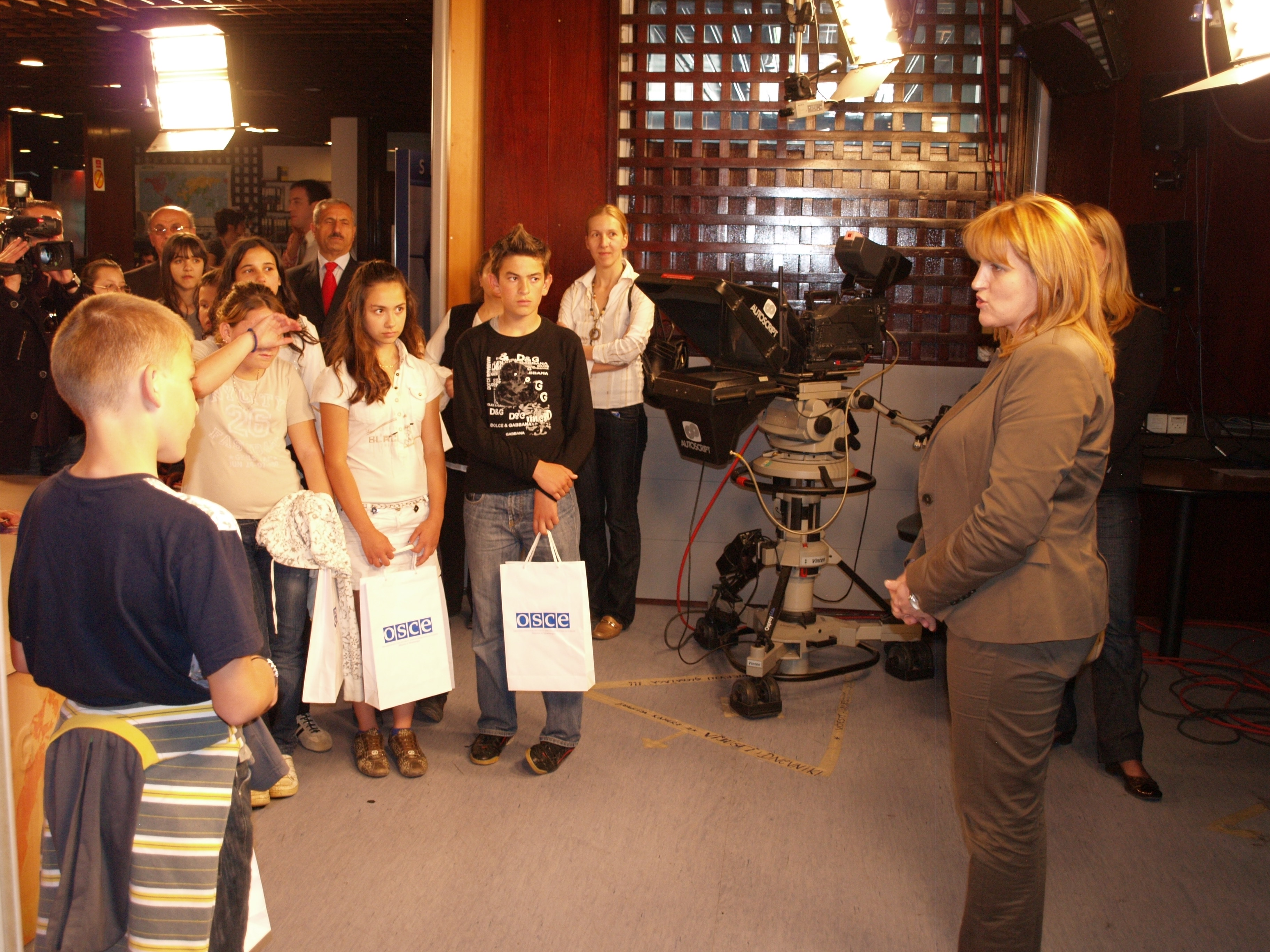 Marina Vukovic, news editor of Montenegro's Public Service Broadcasting (right), answers questions from young journalists from Marshal Tito School in Ulcinj during their visit to Podgorica, 6 May 2009.