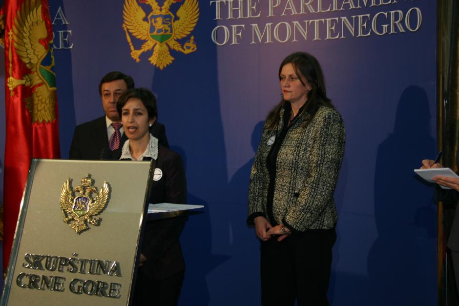 Jamila Seftaoui, OSCE Senior Gender Advisor (c), Jose Mendes Bota of PACE (l) and Nada Drobnjak, Chairperson of the Parliamentary Committee for Gender Equality at a press conference on violence against women in the Parliament of Montenegro, 8 Dec. 2009