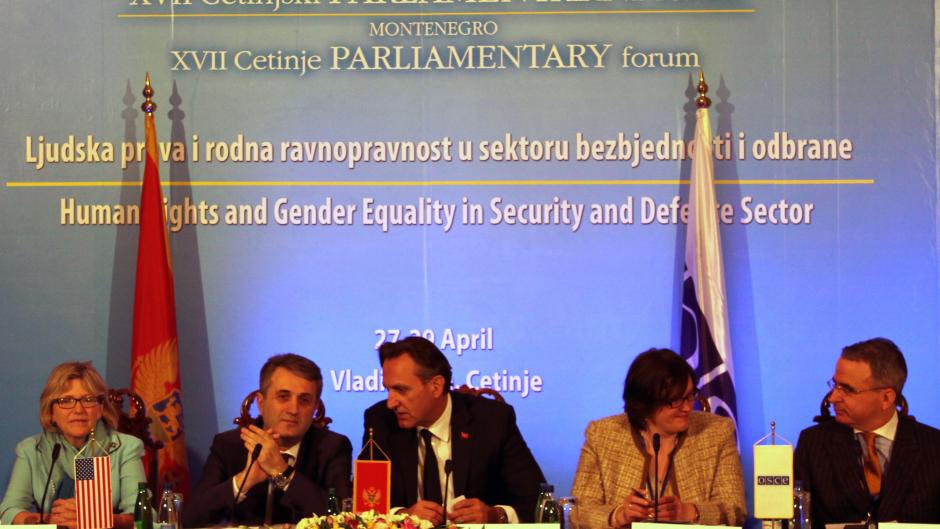 (r-l)Director of the Office of the OSCE Secretary General, Ambassador Marcel Pesko, US Ambassador to Montenegro Margaret Uyehara, Chairperson of the Security and Defense Committee Mevludin Nuhodzic, Parliament Speaker Ranko Krivokapic, Chairperson of Gender Equality Committee Nada Drobnjak and Deputy Head of OSCE Mission to Montenegro Dan Redford at the Cetinje Parliamentary Forum in Cetinje, 28 April 2015.