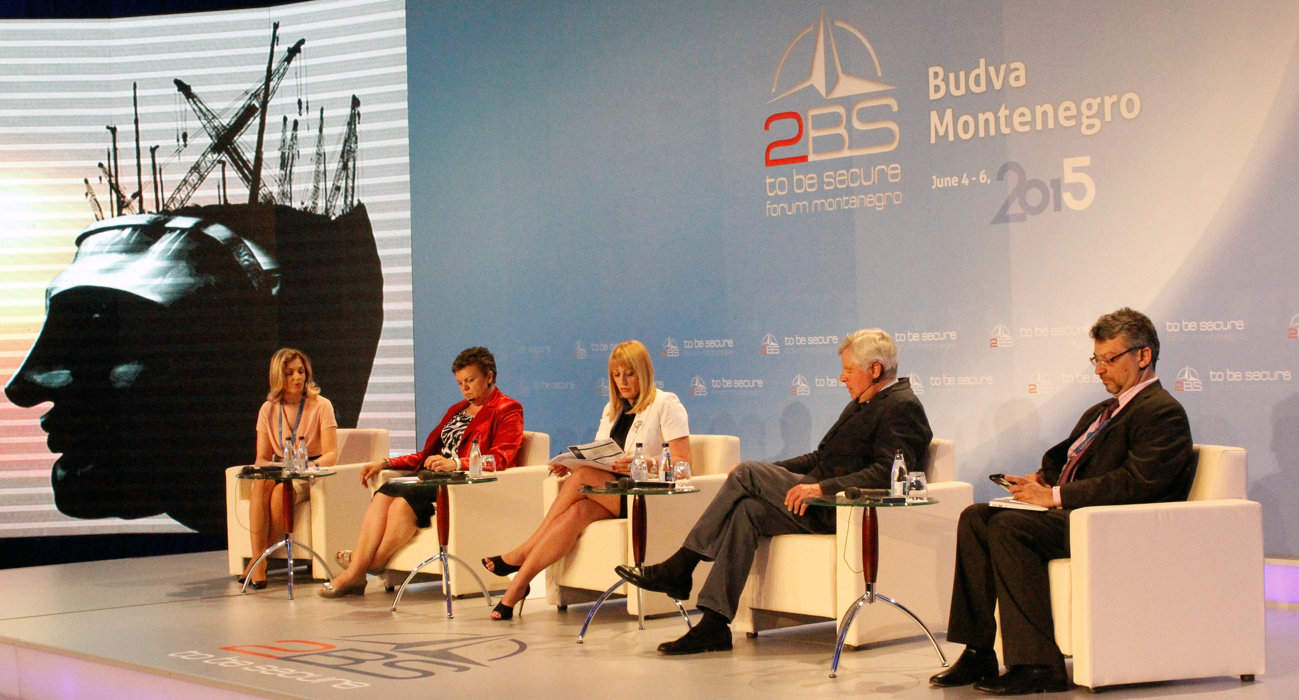 (l-r) Dr. Valbona Zeneli, Director of the Black Sea Eurasia Program at the George C. Marshall European Center for Security, Amb. Janina Hřebíčková, Head of the OSCE Mission to Montenegro, Jadranka Joksimović, Minister without portfolio responsible for European integration, Serbia, Amb. Pieter Feith, Senior Diplomat and International Crisis Management Expert, Netherlands and Dr. Ariel Cohen, Director, Center for Energy, Natural Resources and Geopolitics, USA, at the 2BS security forum, Budva, 6 June 2015.