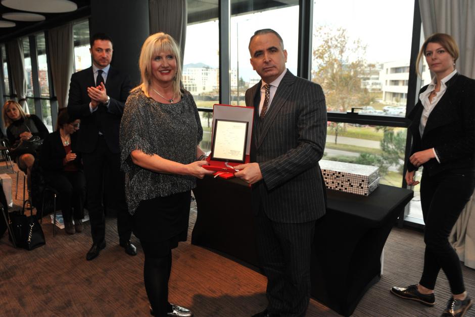 Dan Redford, Deputy Head of the OSCE Mission in Montenegro (centre right) awarding Snezana Matijevic, Mayor of municipality of Tivat, for municipality's work with civil society, in particular a project "Roma and Egyptian assistant and mediator in the education", Podgorica, 12 December, 2016.