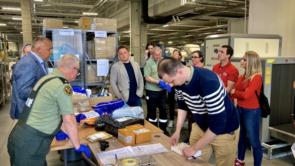 Suspicious parcels being inspected by customs officials for possible trafficked cultural property at postal sorting center in Vilnius, Lithuania.