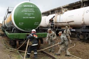 RADEKHIV, Ukraine, 19 November - Specialists filled railway tanks with a toxic rocket fuel component that had been stored in deteriorating containers at a military base in Western Ukraine today in preparation for shipping...