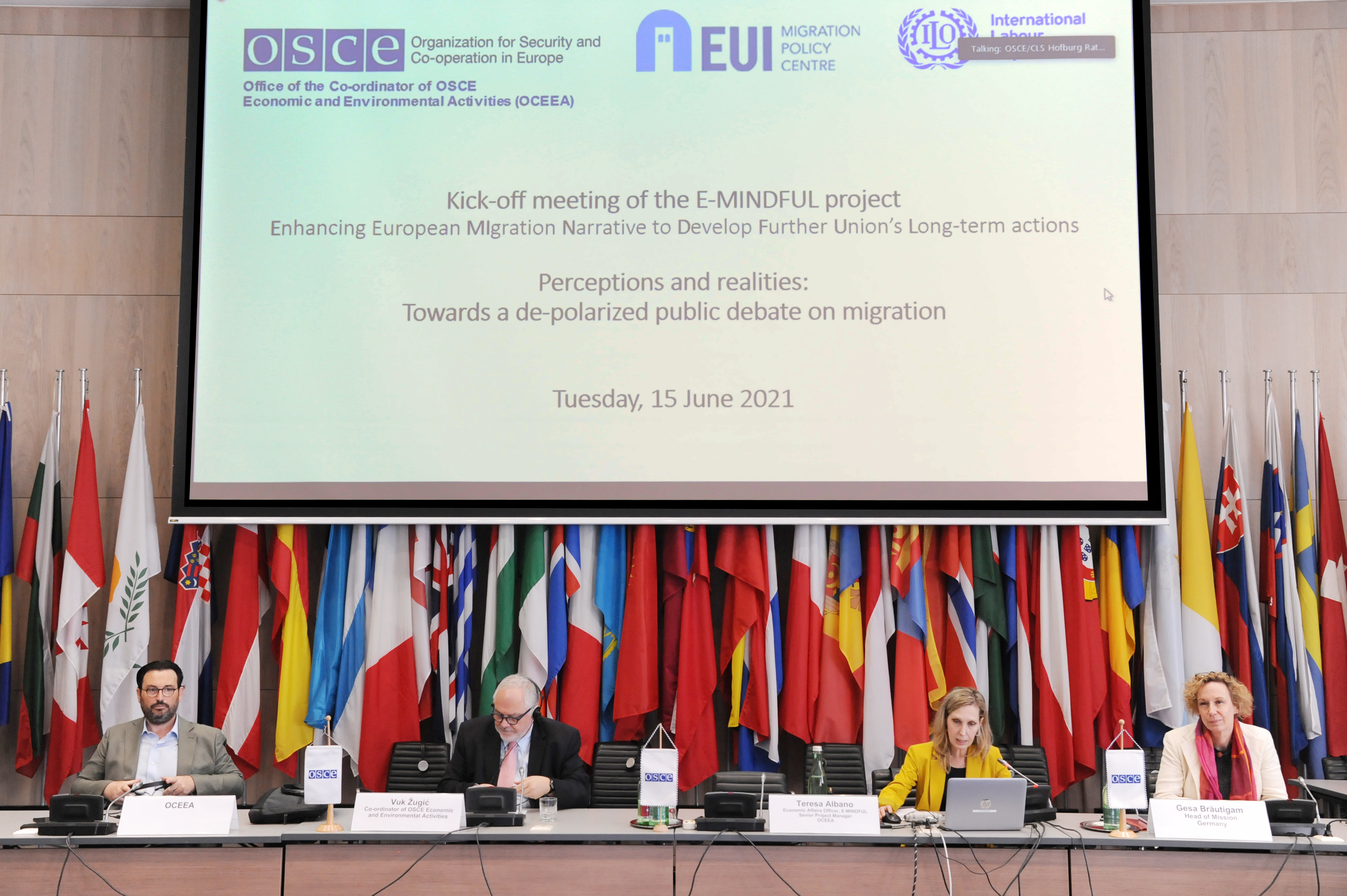 OSCE Senior Economic Officer Lorenzo Rilasciati, Co-ordinator of OSCE Economic and Environmental Activities Vuk Žugić, E-MINDFUL Senior Project Manager Teresa Albano and Ambassador Gesa Bräutigam, Head of Mission OSCE Permanent Mission of Germany, at the E-MINDFUL kick-off meeting, 15 June 2021, Vienna.