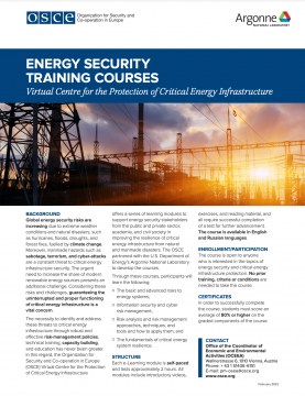 The OSCE-Argonne National Laboratory’s e-learning course on the Protection of Critical Energy Infrastructure support energy security stakeholders from the public and private sector, academia, and civil society in improving the resilience of critical energy infrastructure from natural and manmade disasters. The course is free and open to everyone and is available in English and Russian on the OSCE E-learning Platform: https://bit.ly/3Jpp1OZ