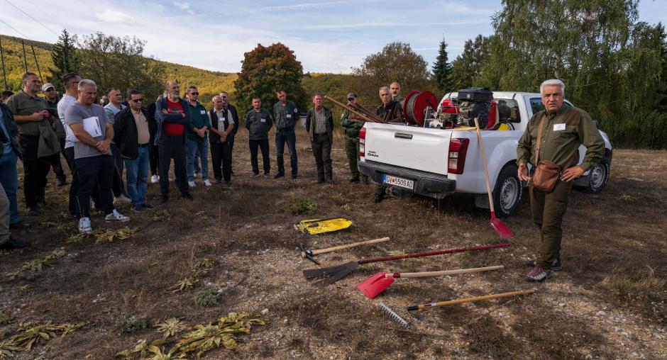 On 9 and 10 October 2023, the OSCE partnered with the Global Fire Monitoring Center (GFMC) and Regional Fire Monitoring Center for South-Eastern Europe and South Caucasus (RFMC) to train over 40 participants representing the park management authorities and the civil emergency response units of the municipalities in the four protected areas of Korab-Koritnik, Mavrovo, Shar Mountain and Sharri/Šara on fire preparedness and response. The “Training on Wildfire Risk Reduction and Landscape Fire Management in the Shar/Šara Mountains and Korab Massif Area” included also a field exercise on forest fire suppression in Mavrovo, North Macedonia.