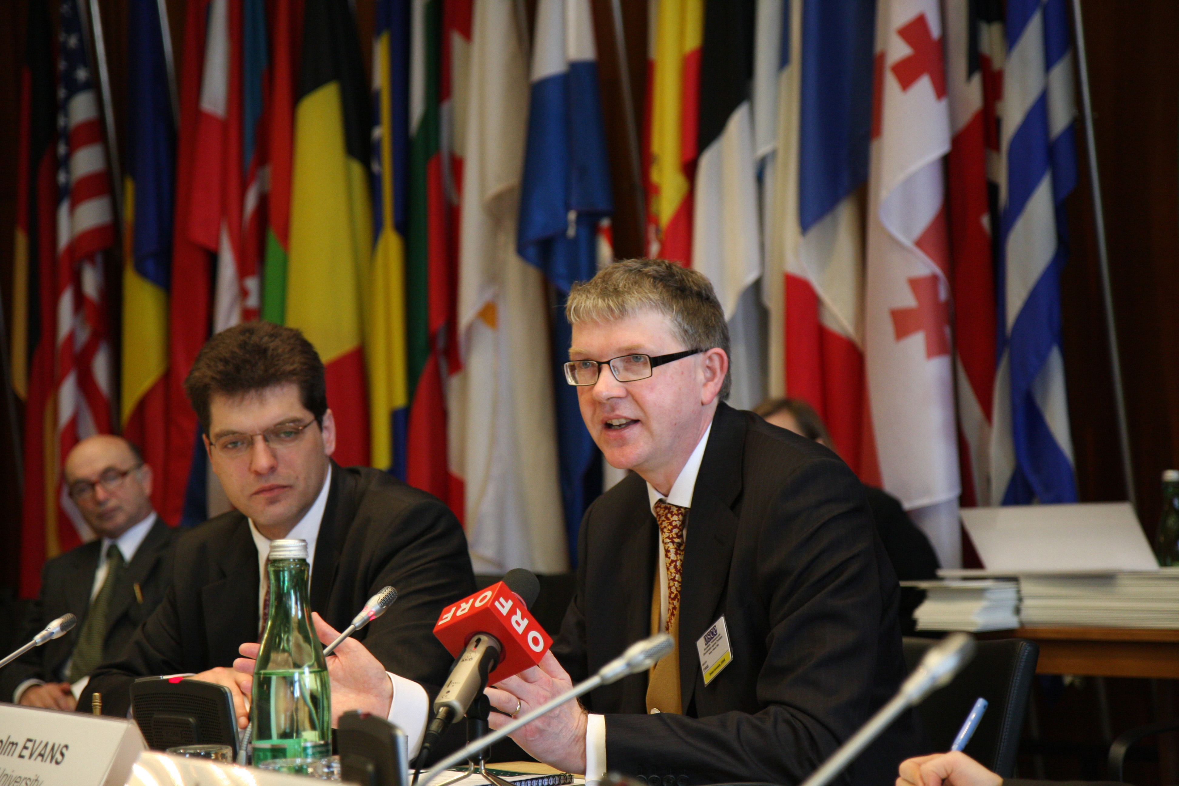 ODIHR Director Janez Lenarcic listens as Malcolm Evans, a member of the OSCE/ODIHR Advisory Council on Freedom of Religion or Belief, delivers the keynote address at a meeting on intolerance and discrimination against Christians, Vienna, 4 March 2009.