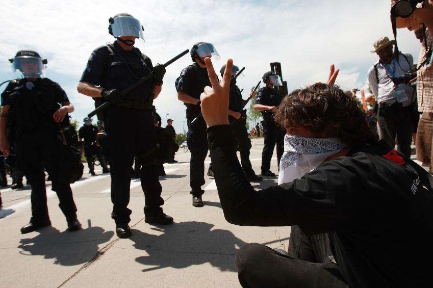 Police stand guard as protesters demonstrate outside the site of the US Democratic Party’s National Convention, Denver, 24 August 2008.
