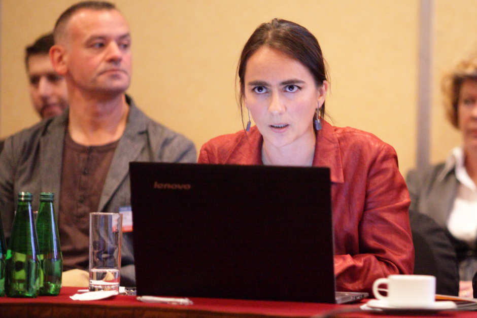 Gabriella Tonk, a municipal officer with the city of Cluj Napoca, Romania, addresses participants of a side event during the Human Dimension Implementation Meeting, Warsaw, 24 September 2013.