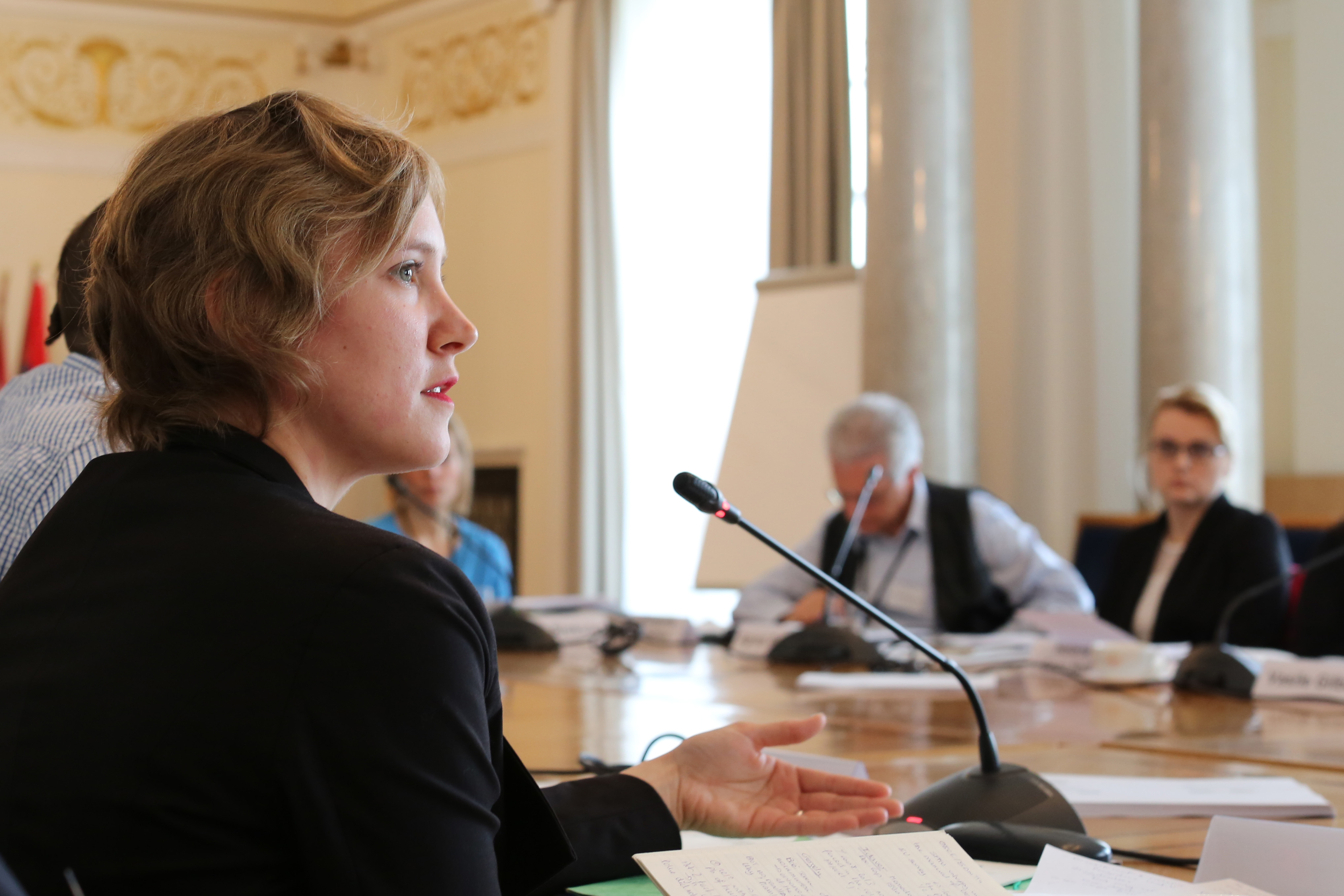 Loé Lagrange, Office Coordinator from ADC Memorial Brussels speaking at the OSCE Expert Meeting on Police and Roma and Sinti: Current Challenges and Good Practices in Building Trust and Understanding, taking place on ODIHR premises in Warsaw, 8 April 2014.