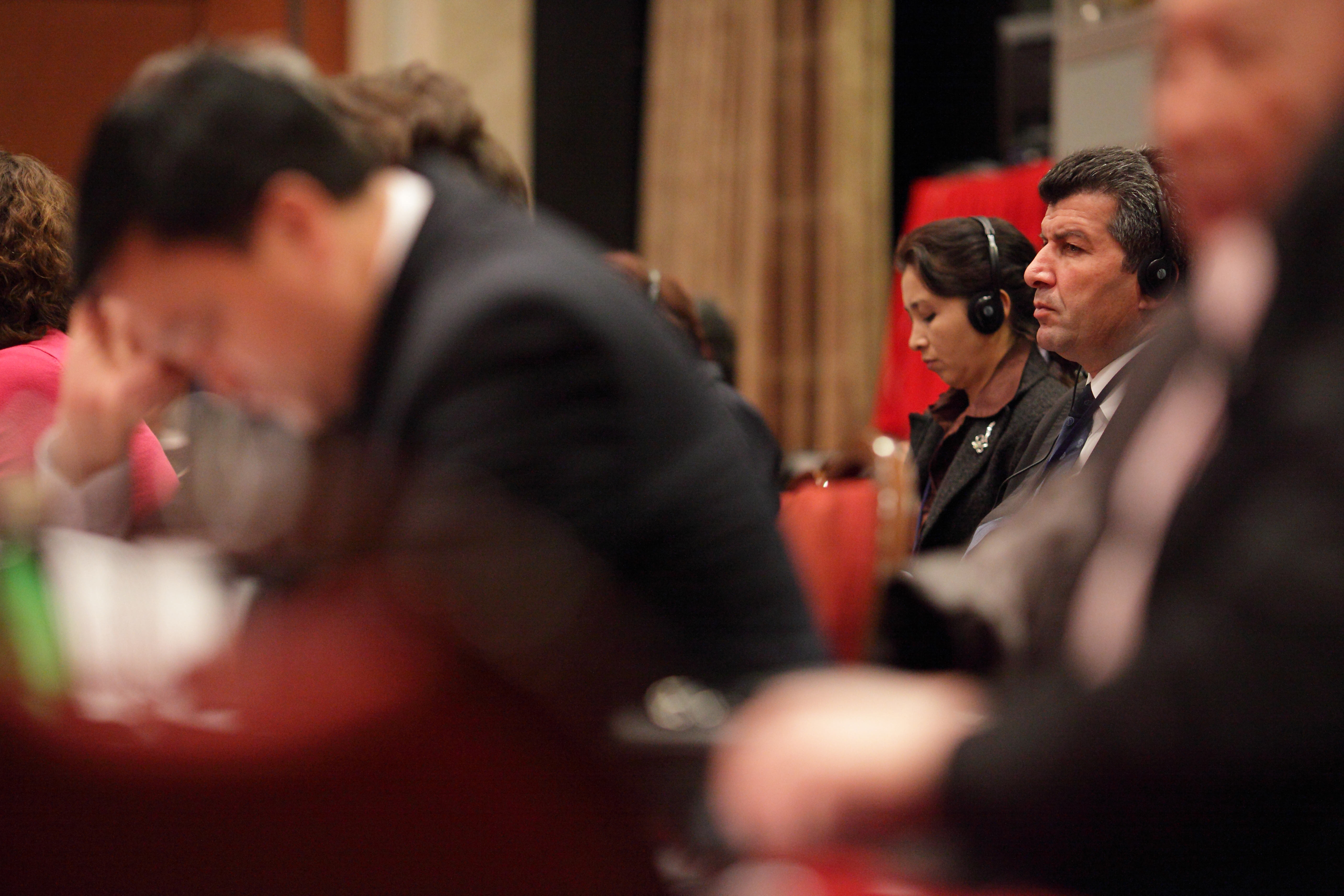 Malokhat Muratova (left), Legal Assistance Programme Coordinator of the Tashkent-based NGO Istiqbolli Avlod and Alovsat Aliyev (right), Director of the Azerbaijan Migration Centre, at the Human Dimension Implementation Meeting, Warsaw, 1 October 2009.
