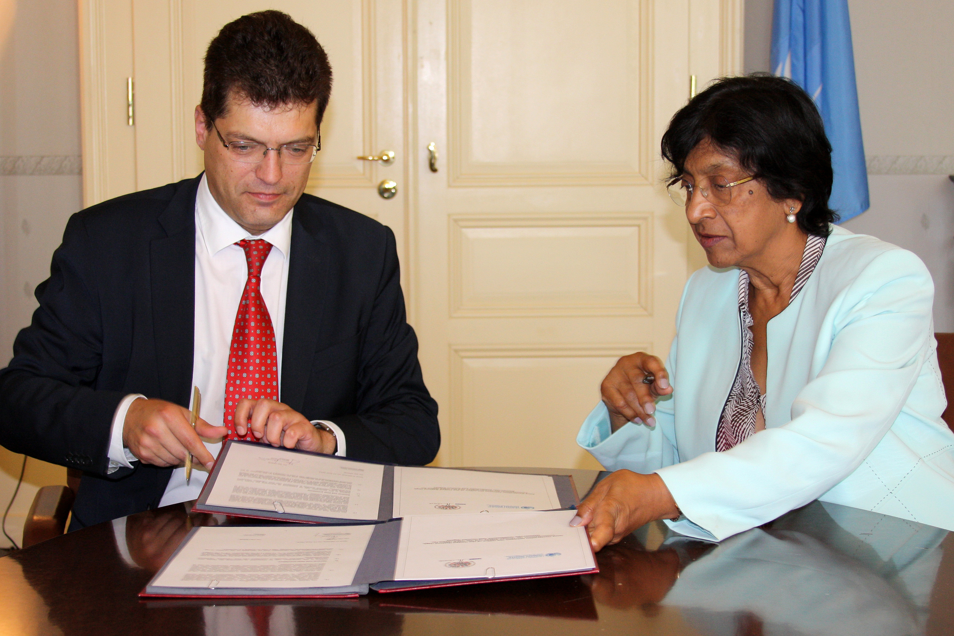 Ambassador Janez Lenarčič, Director of the OSCE Office for Democratic Institutions and Human Rights (l), and Navi Pillay, the United Nations High Commissioner for Human Rights signed a declaration on enhancing co-operation in human dimension, Geneva, 12 June 2014.