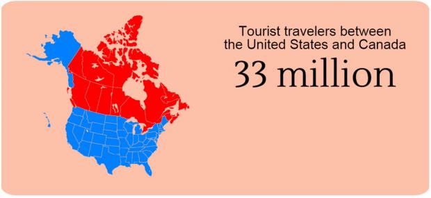 Travel between the United States and Canada, which maintain mutually liberalized cross-border travel regimes, accounts for a large percentage of all foreign visitors from the OSCE region to these two countries: In 2011, 63 per cent of all visitors to the United States originating from the OSCE region came from Canada, while 84 per cent of all visitors to Canada from the OSCE region came from the United States.