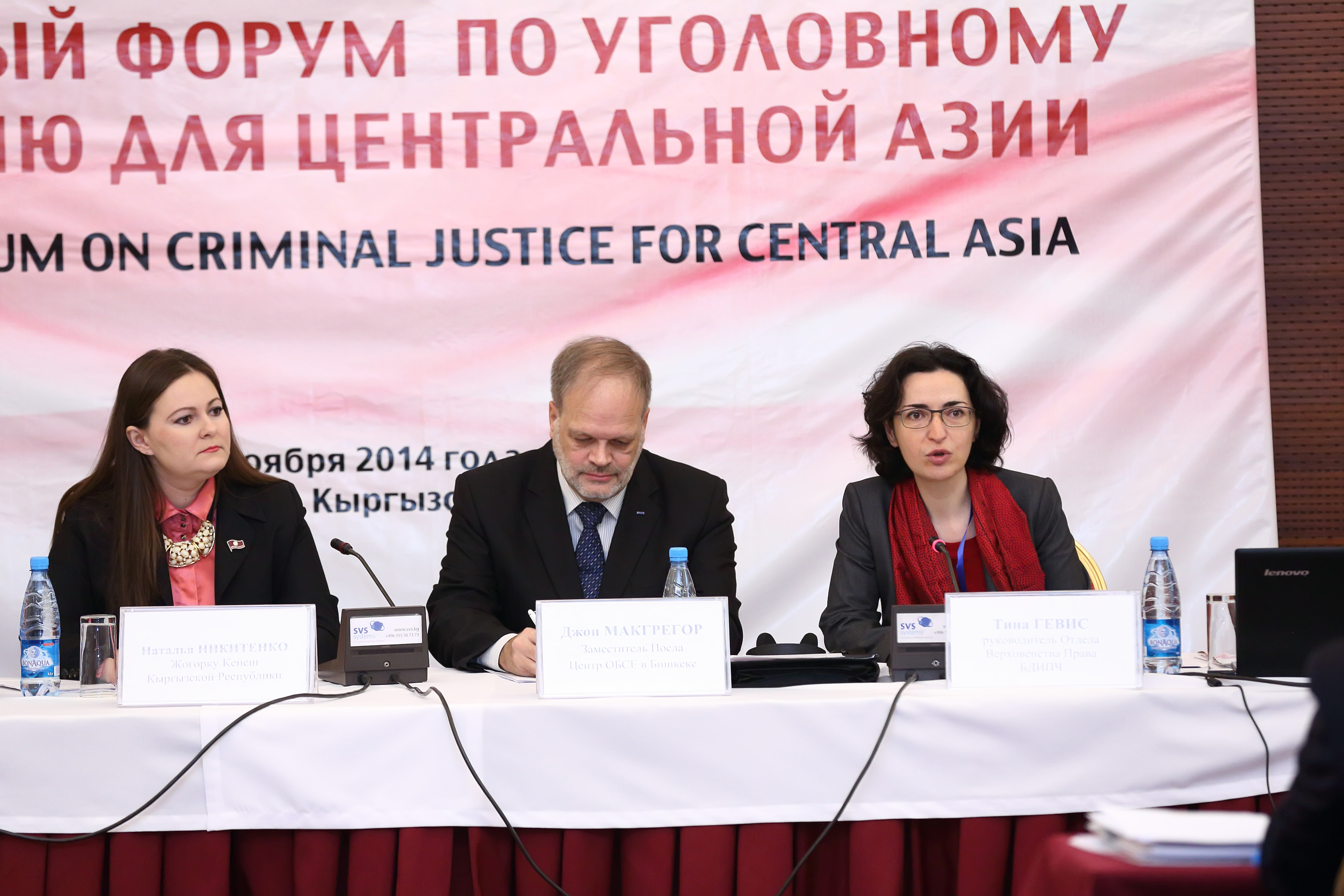 Tina Gewis (r), Chief of ODIHR Rule of Law Unit, together with Nataliya Nikitenko (l), Head of Parliamentary Committee on Human Rights, Constitutional Legislation and State Structure of the Kyrgyz Jogorku Kenesh, and John McGregor (c), the Deputy Head of OSCE Centre in Bishkek at Fifth Expert Forum on Criminal Justice for Central Asia in Bishkek, Kyrgyzstan on 24 November 2014