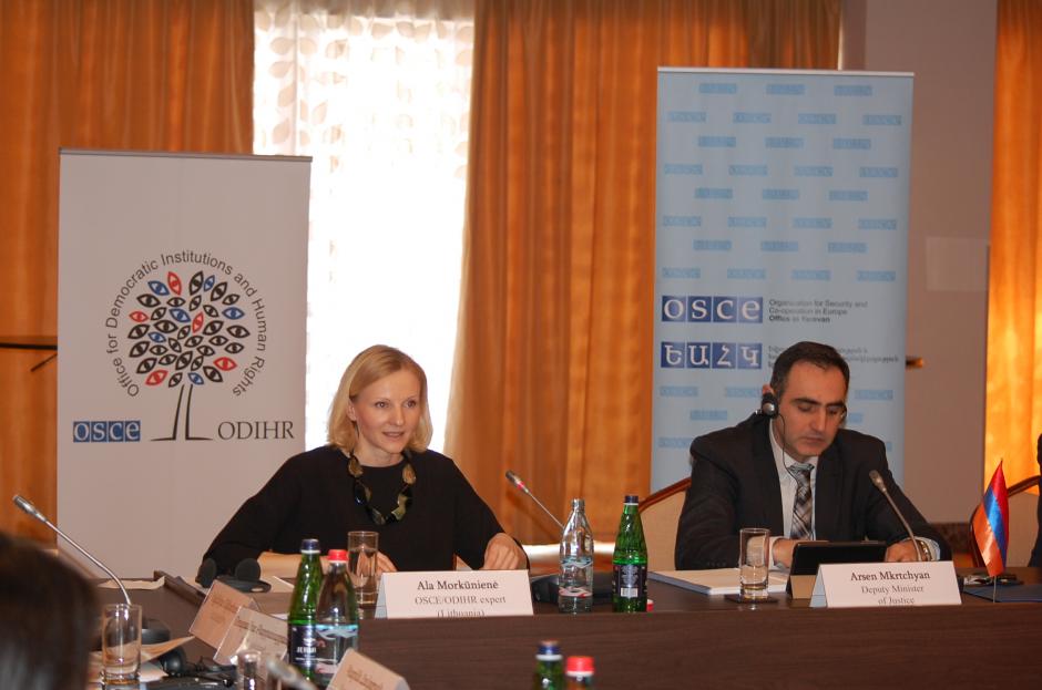 ODIHR expert Ala Morkūnienė (l) and Arsen Mkrtchyan, First Deputy Minister of Justice of Armenia at policy-making and legislative planning workshop in Tsaghkadzor, Armenia, 24 February 2015