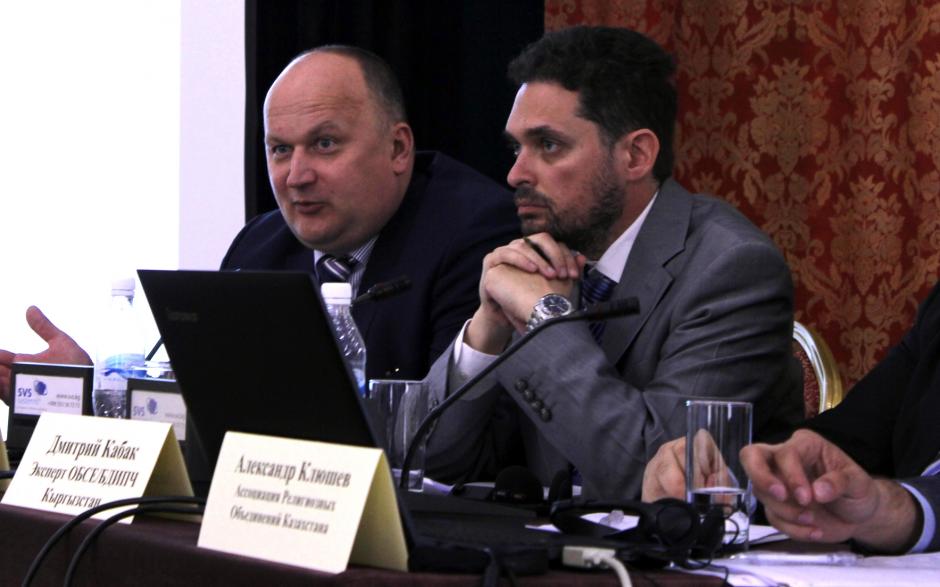 Ringolds Balodis, Professor of Law of Latvian University (left) and Omer Fisher, Deputy Head of the OSCE/ODIHR Human Rights Department, at the meeting on legal personality of religious or belief communities, on 20 April 2015, in Bishkek, Kyrgyzstan