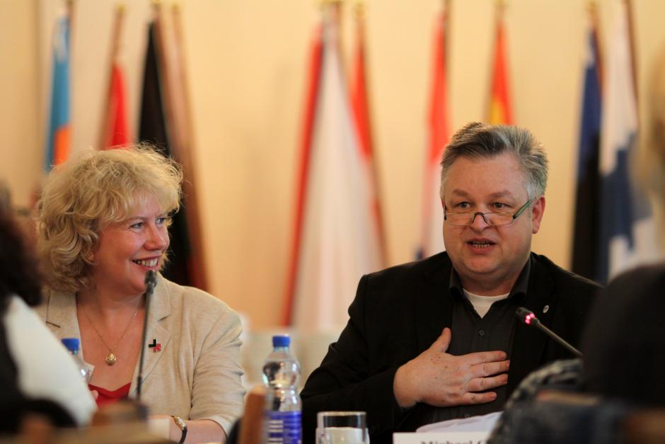 Meg Munn (l), former Member of Parliament and Minister for Women and Equality in the United Kingdom, listens as ODIHR Director Michael Georg Link delivers opening remarks at the Expert Meeting on Good Practices for Advancing Women's Political Participation in the OSCE Region, in Warsaw, Poland, 26 May 2015