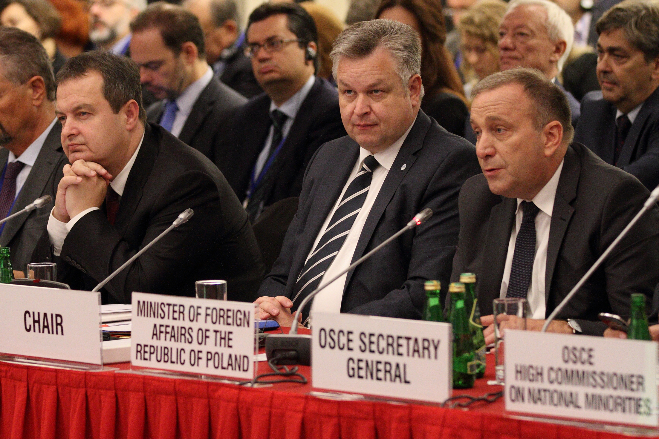 Ivica Dačić (l), OSCE Chairperson in Office and Foreign Minister of Serbia and Michael Georg Link (c), Director of OSCE/ODIHR, listening to Grzegorz Schetyna, Polish Minister of Foreign Affairs, during his opening address at 2015 Human Dimension Implementation Meeting (HDIM) in Warsaw, 21 September 2015