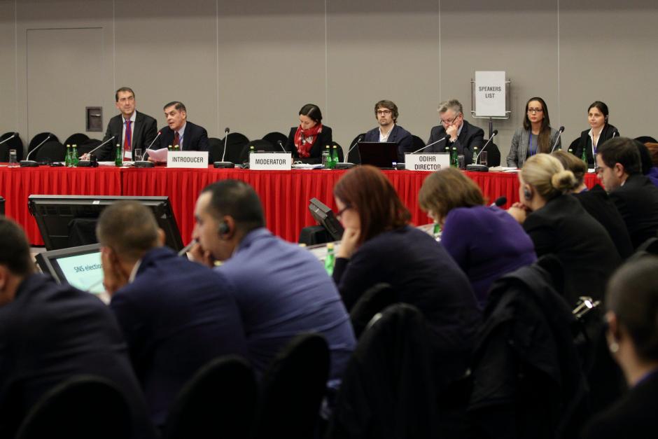 Romani Rose (l), Chairman of the Council of German Sinti and Roma, making his opening remarks, while Mirjam Koraly (c), ODIHR Senior Adviser on Roma and Sinti Issues, Michael Georg Link (r), ODIHR Director, and other Roma activists listen, during an event at Human Dimension Implementation Meeting in Warsaw, 30 September 2015