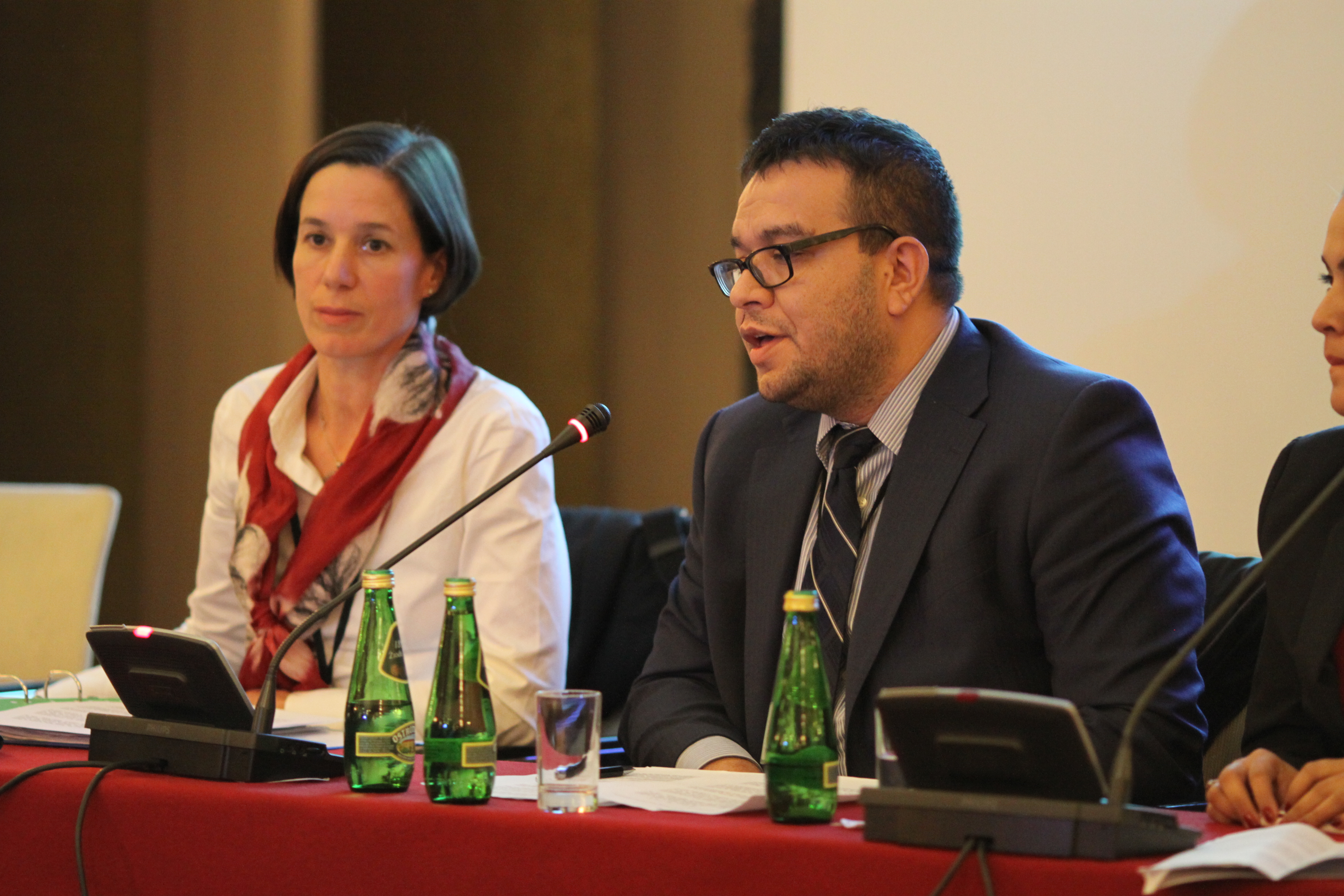 Mirjam Karoly (l), ODIHR Senior Adviser on Roma and Sinti Issues listening to Idaver Memedov (r), ODIHR Roma and Sinti Officer, making introduction at an event on Roma and policing practices, during Human Dimension Implementation Meeting in Warsaw, 30 September 2015