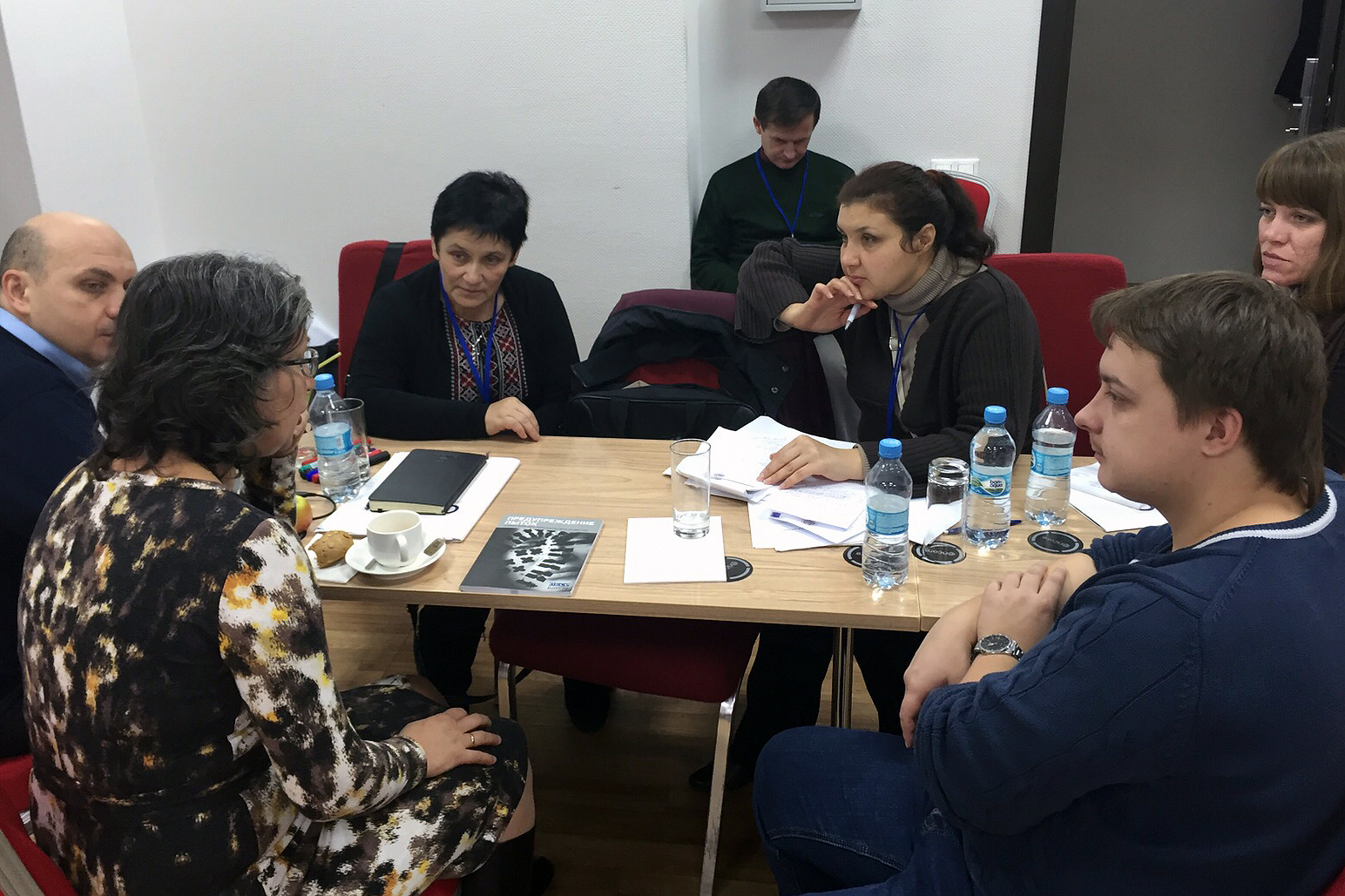 Civil society participants listen as ODIHR trainer Yelena Volochai (l) covers issues related to human rights monitoring at a training event, Kyiv, 5 November 2015.