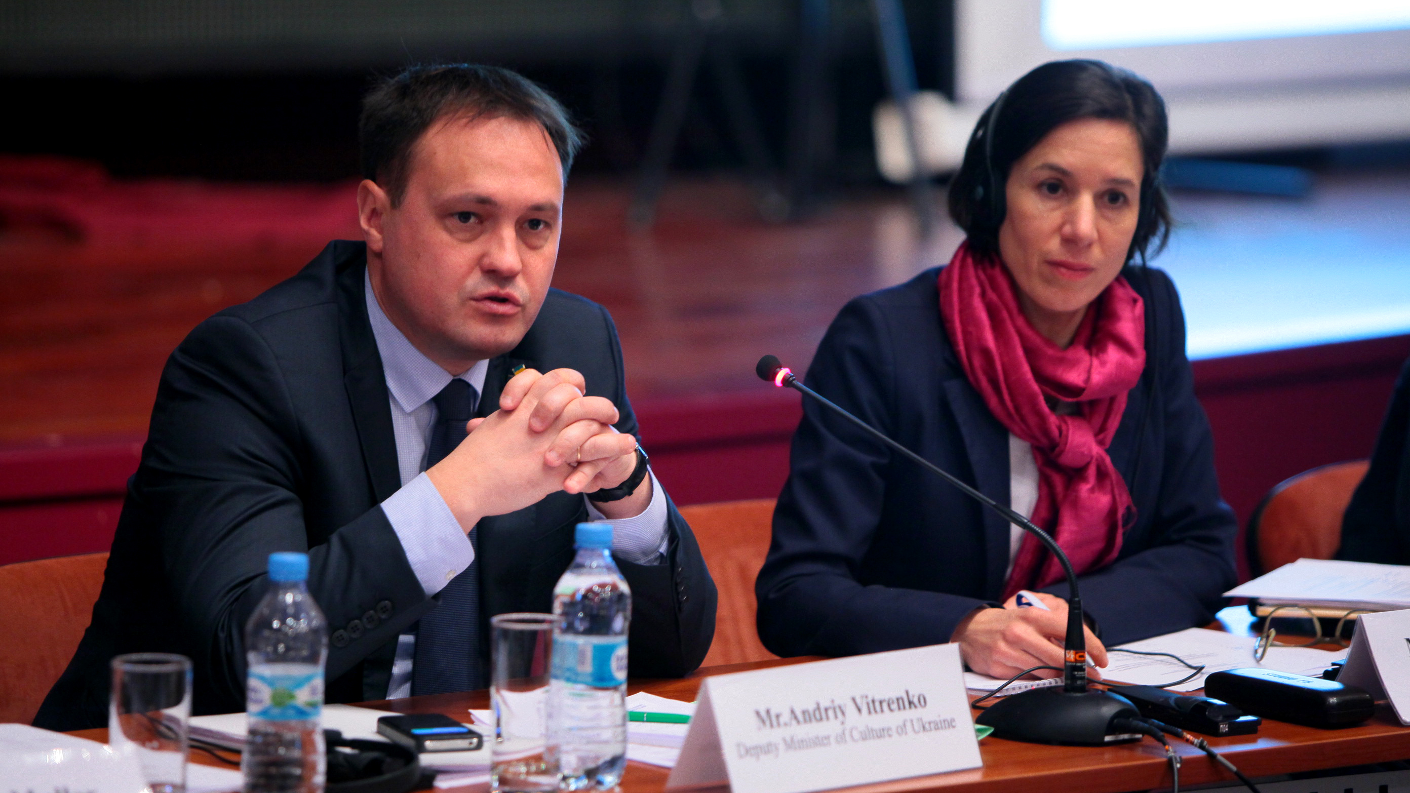 Andriy Vitrenko (l), Deputy Minister of Culture of Ukraine, speaking at a roundtable meeting on the situation of Roma in Ukraine, while Mirjam Karoly, ODIHR's Senior Adviser on Roma and Sinti Issues listens, in Kyiv, 24 November 2015