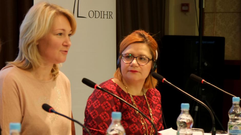 Maria Ionova (l), Member of the Verkhovna Rada of Ukraine speaking at an event, co-organized by OSCE/ODIHR in Kyiv, on role of women politicians in peace-building process in Ukraine, as Lana Ackar (r), Associate Gender Officer at ODIHR listens, 16 December 2015