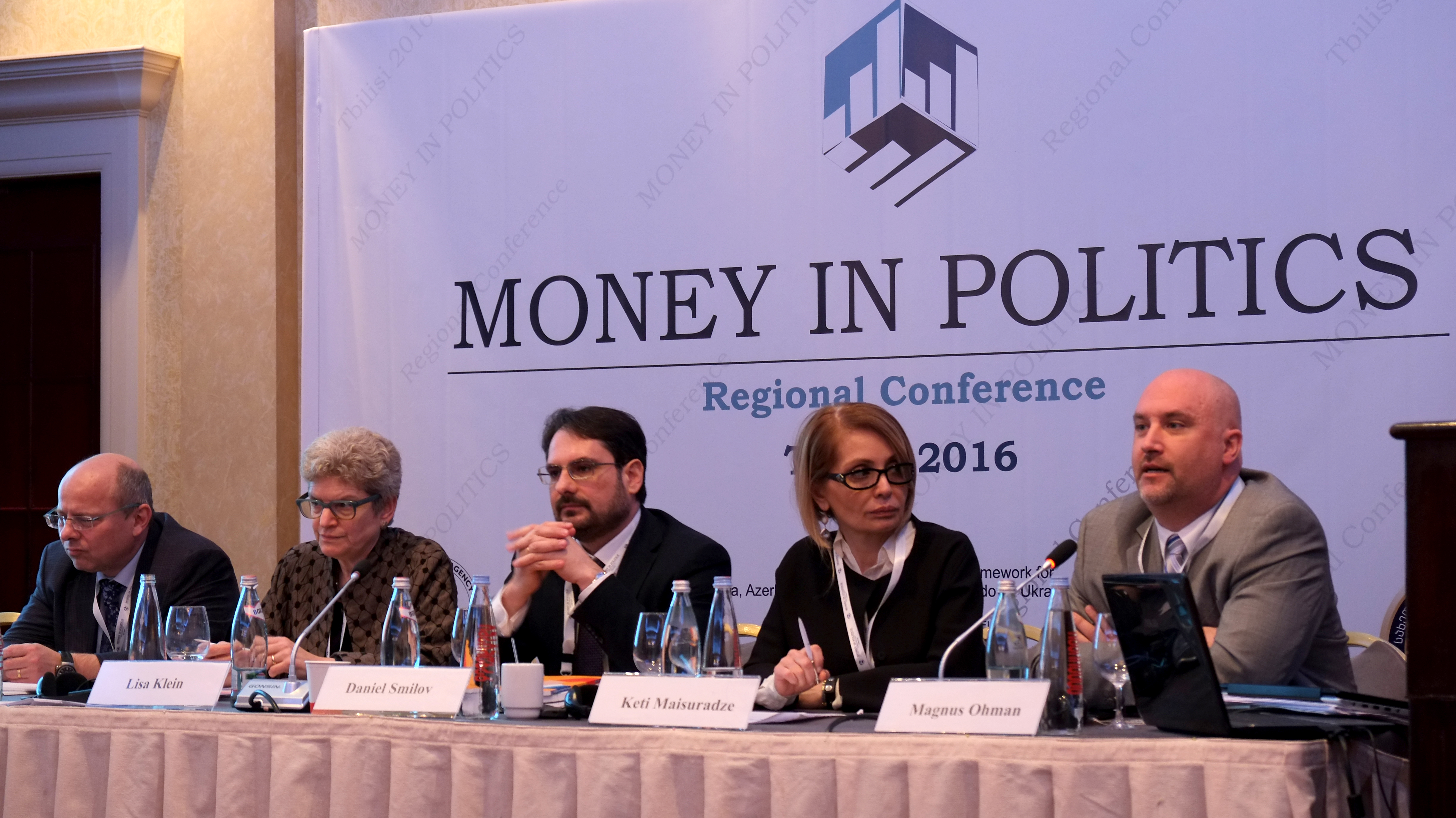Magnus Ohman (r), IFES Senior Political Finance Adviser and Director of Regional Europe Office speaking at an event on financial regulations in politics, while Keti Maisuradze (c-r), IFES Deputy Chief of Party of Georgia, Daniel Smilov (c), Associate Professor at the Political Science Department of University of Sofia, Lisa Klein (c-l), Political Finance Specialist, and Christophe Speckbacher (l), Head of Section of Council of Europe's Secretariat of the GRECO listen, in Tbilisi, 18 February 2016