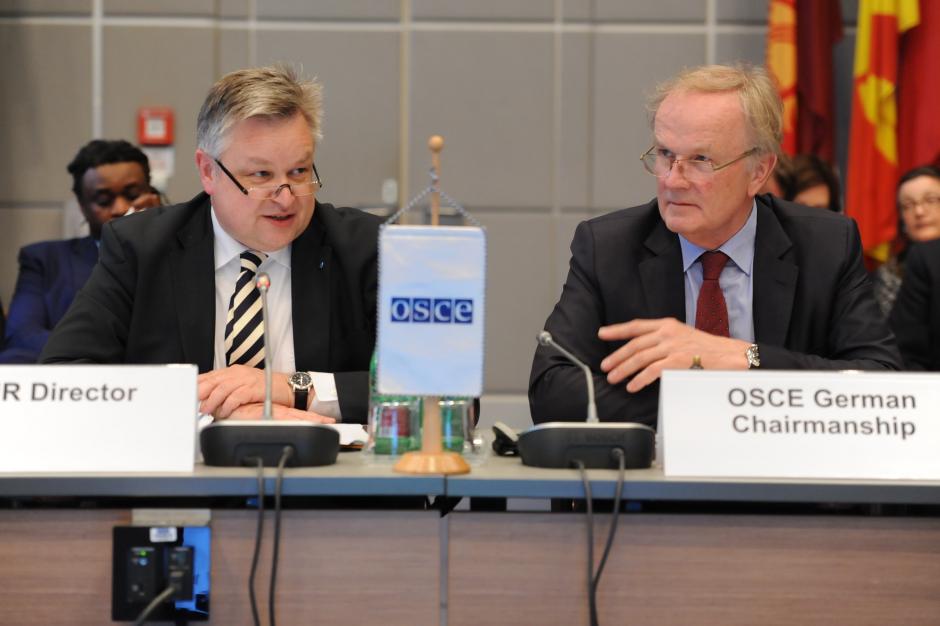 (L-r): Michael Georg Link, Director of the OSCE Office for Democratic Institutions and Human Rights and Ambassador Eberhard Pohl, 2016 Chairperson of the Permanent Council, during an OSCE meeting on Countering intolerance and discrimination, Vienna, 14 April 2016.
