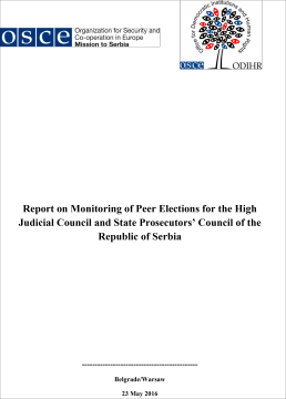 This report is the result of joint efforts by the OSCE Mission to Serbia and the Office for Democratic Institutions and Human Rights (ODIHR) to monitor the nomination and election processes for peer elections of judges and prosecutors in Serbia to the High Judicial Council (HJC) and the State Prosecutors’ Council (SPC), respectively, conducted from October to December 2015. The Lawyers’ Committee for Human Rights (YUCOM), a Serbian nongovernmental organization, also served as an implementing partner. This monitoring was conducted in consideration of ongoing judicial and legal reform initiatives in Serbia as part of a broader National Justice Reform Strategy and ongoing reforms for accession to the European Union (EU). Activities included monitoring nomination processes (in selected courts and prosecutor’s offices), monitoring peer elections across Serbia, analyzing the underlying legal framework, and interviewing judges and prosecutors who participated in the process.