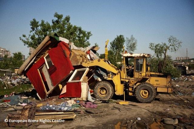 Bulldozer demolishes a house in Belvil settlement in Belgrade, 26 April 2012
