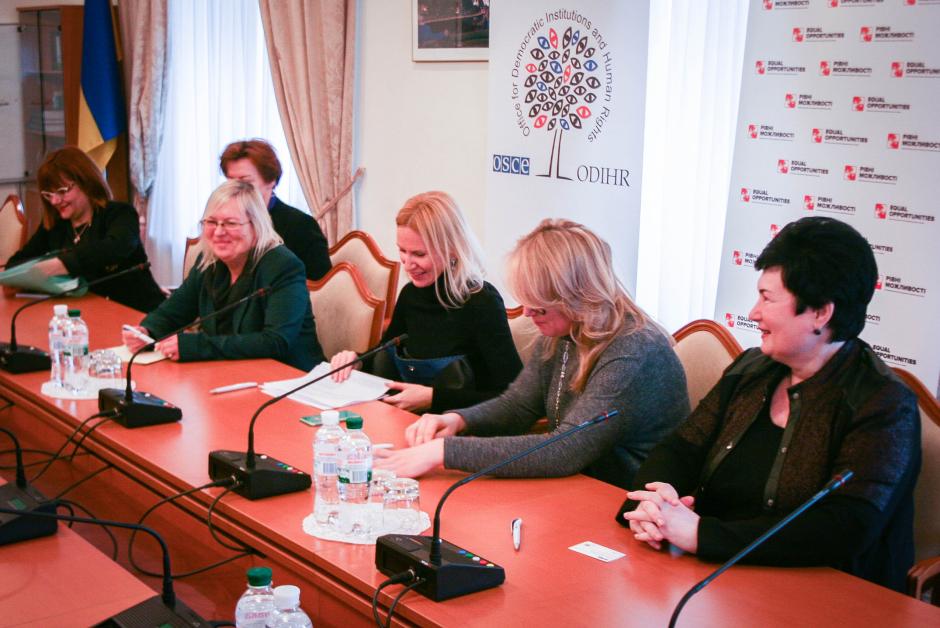 ODIHR's First Deputy Director Katarzyna Jarosiewicz-Wargan (second left) with co-chairs of the Ukrainian parliament's Equal Opportunities Caucus, Olena Kondratiuk, Maria Ionova and Svitlana Voytsekhovska (left to right), during the signing ceremony of a memorandum of co-operation to support national efforts towards gender equality, Kyiv, 23 February 2017.