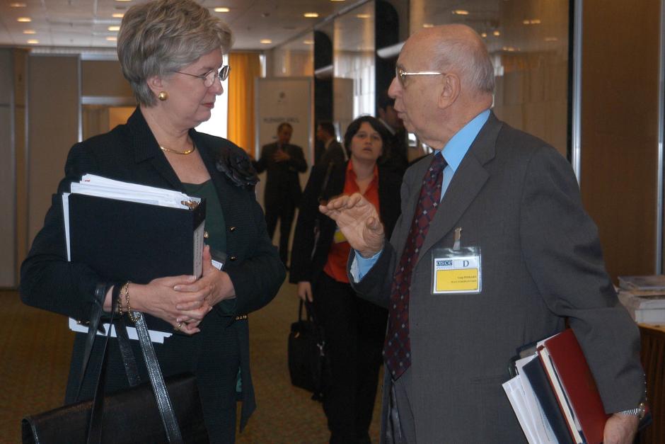 Ambassador Anton Rupnik (right), Head of the OSCE Centre in Almaty, meeting with Ambassador Pamela Hyde Smith, Head of the U.S. delegation, at the OSCE's Human Dimension Implementation Meeting, which was held in Warsaw 6-17 October 2003.