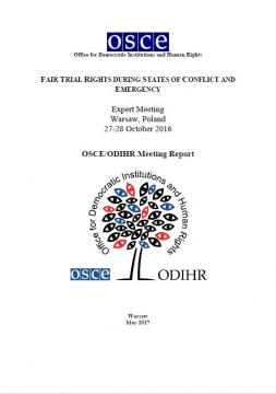 The report provides a summary of an expert meeting on fair trial during states of conflict and emergency convened by OSCE/ODIHR in Warsaw on 27-28 October 2016. The report also sets out the proposals made by expert participants for action by ODIHR to assist OSCE participating States and civil society in ensuring the right to a fair trial and the administration of justice.
