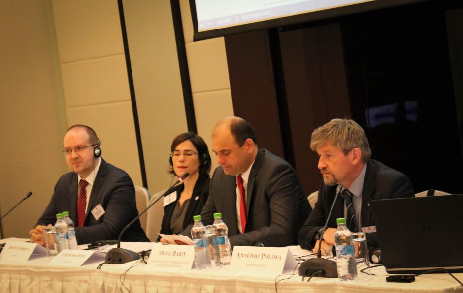 Left to right: Juris Gromovs, ODIHR's Migration/Freedom of Movement Adviser, Christine Hirst, Deputy Head of ODIHR's Democratization Department, Oleg Babin, Moldova's Deputy Interior Minister, and Antonio Polosa, Head of the International Organization for Migration (IOM) Mission to Moldova, at an international conference on migrant integration issues organized by OSCE/ODIHR in co-operation with Moldova’s Interior Ministry, 17 May 2017, Chisinau.