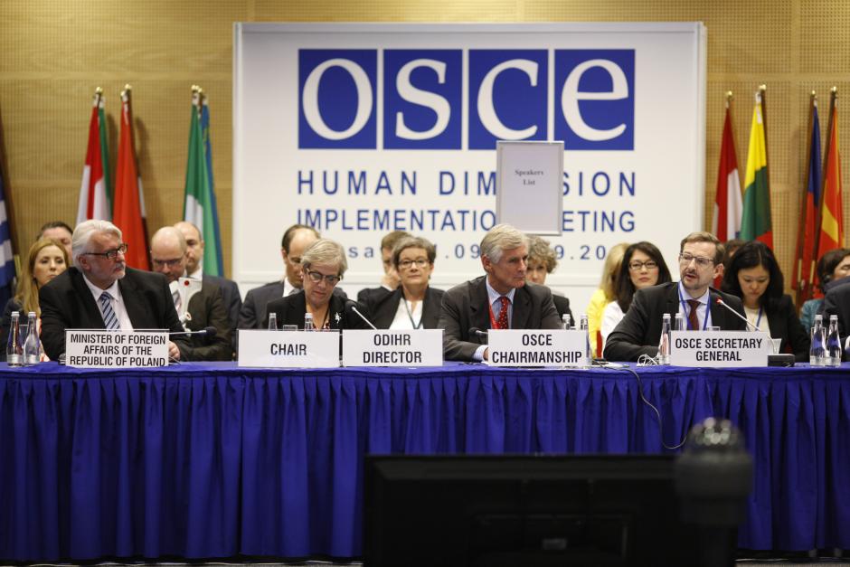 Left to right: Polish Foreign Minister Witold Waszczykowski, ODIHR Director Ingibjörg Sólrún Gísladóttir, Austrian Deputy Foreign Minister Michael Linhart and OSCE Secretary General Thomas Greminger during the Opening Plenary Session of the 2017 Human Dimension Implementation Meeting, 11 September 2017, Warsaw.